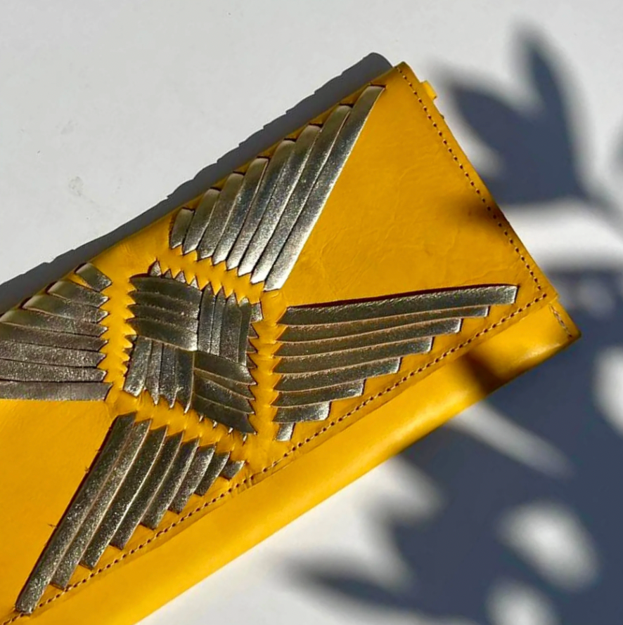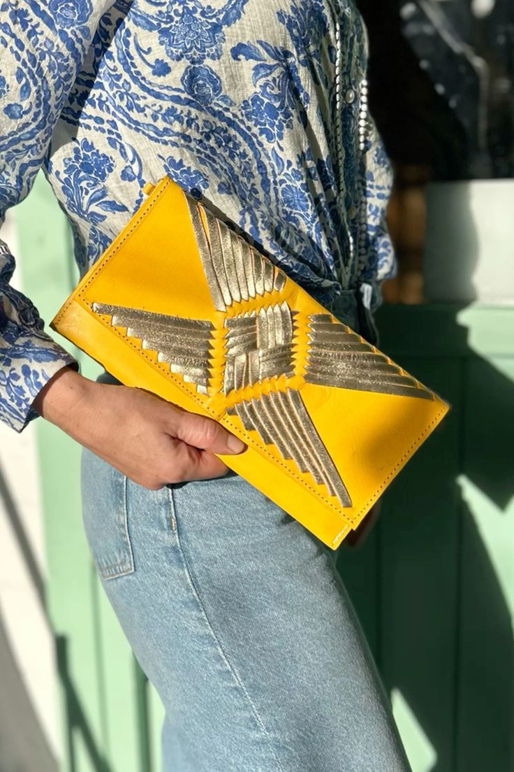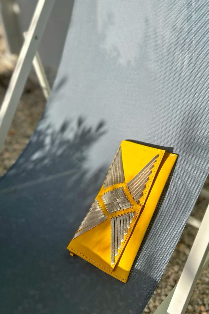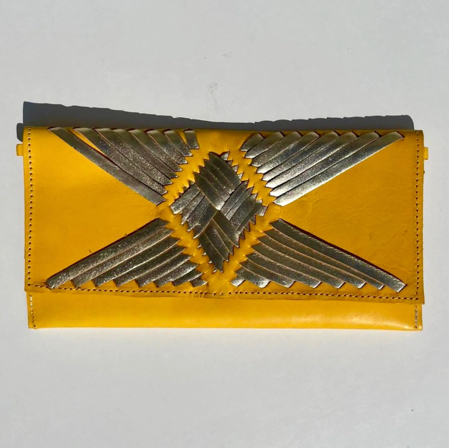 Pochette en cuir doré et jaune, tressée sur le devant entièrement à la main selon une technique traditionnelle mexicaine transmise depuis des siècles.