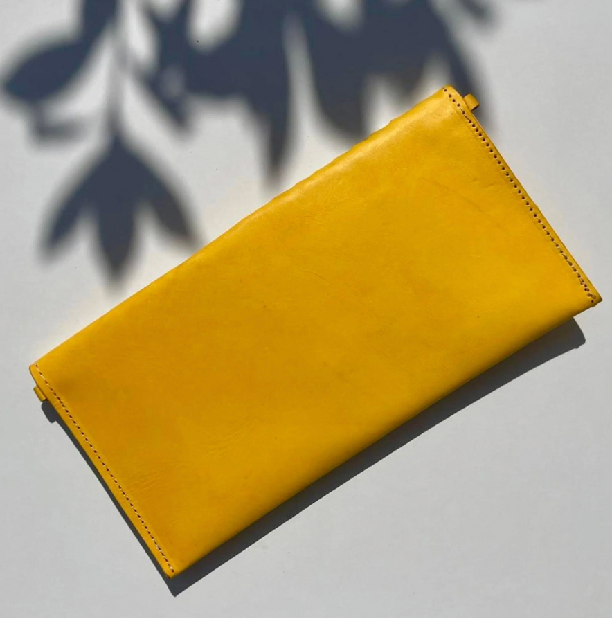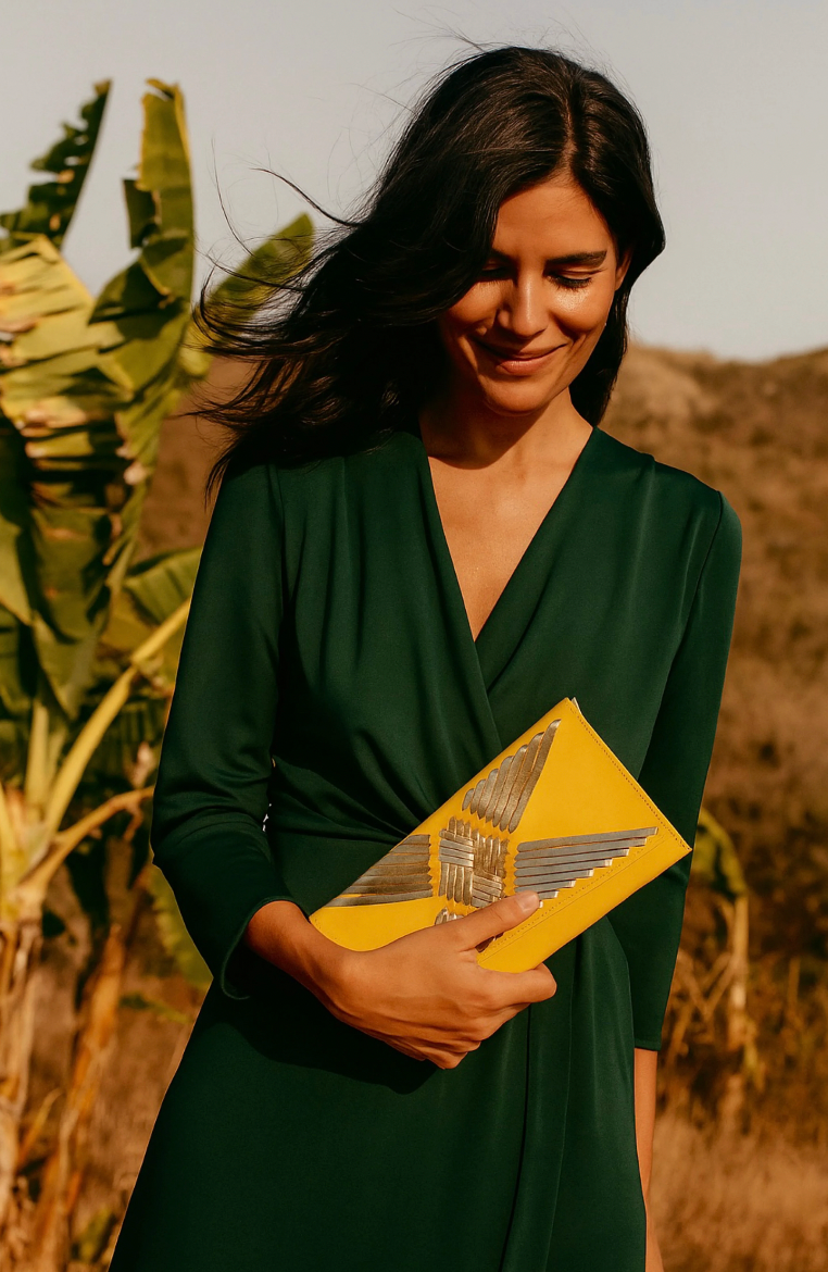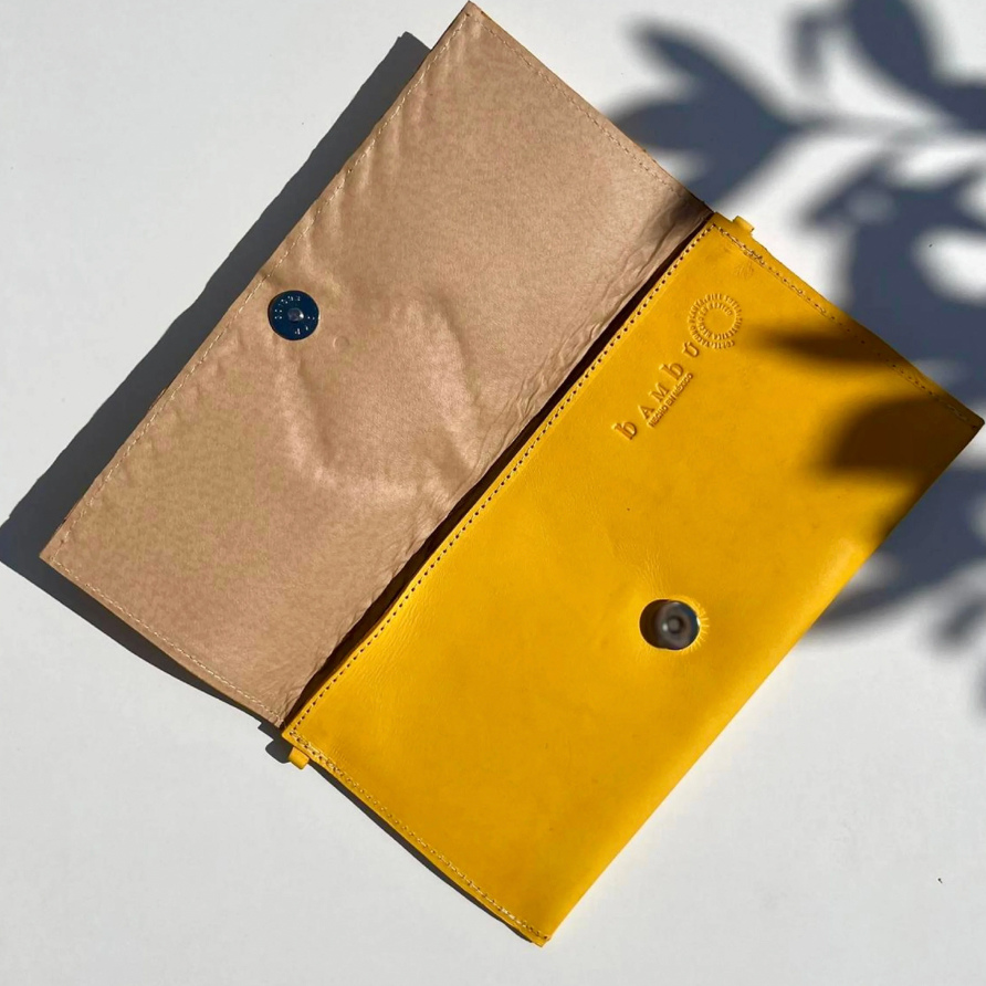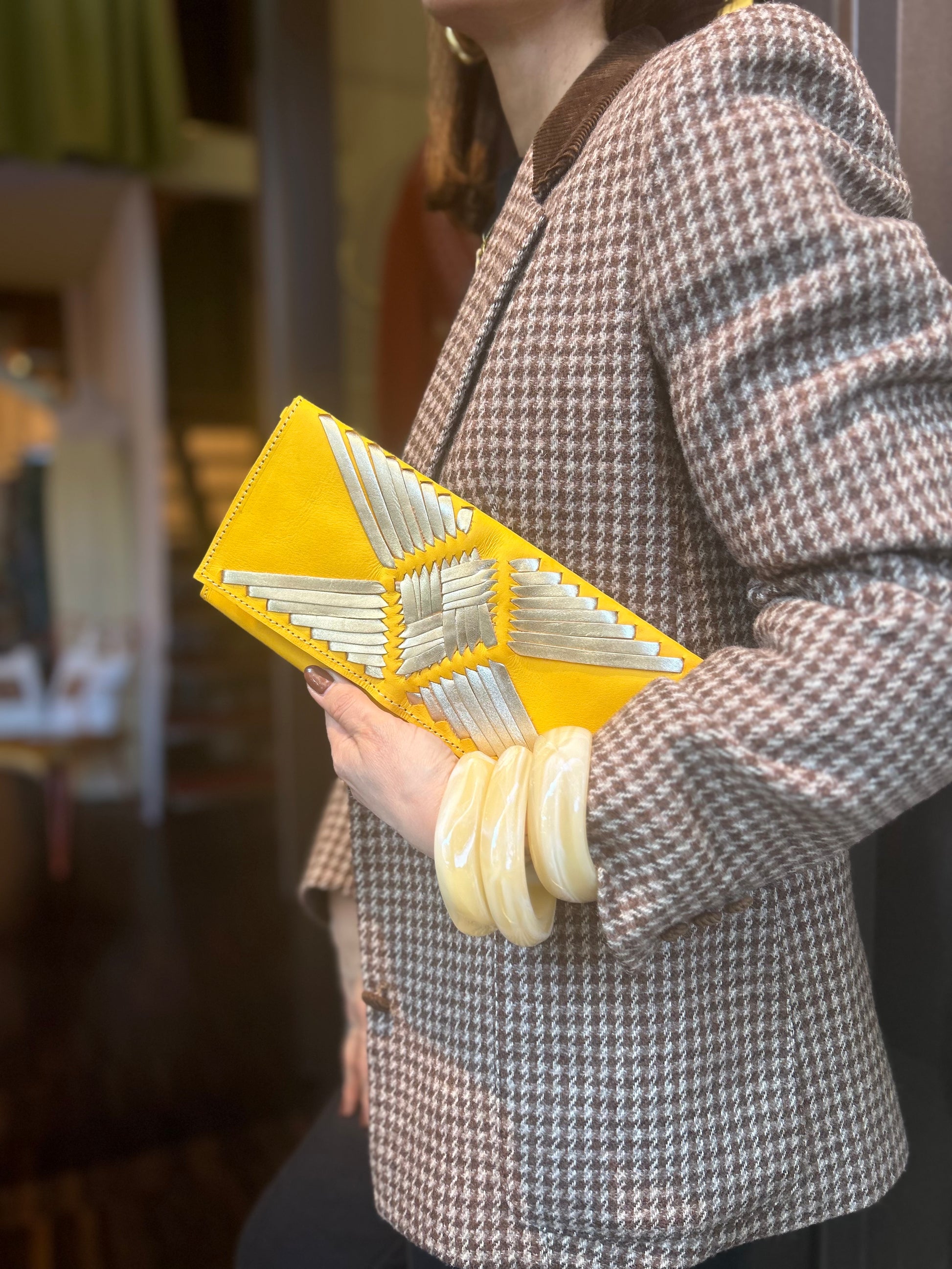 Pochette en cuir doré et jaune, tressée sur le devant entièrement à la main selon une technique traditionnelle mexicaine transmise depuis des siècles.
