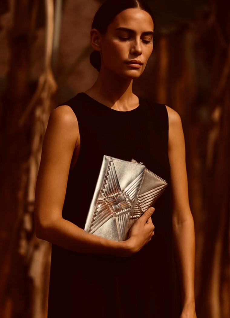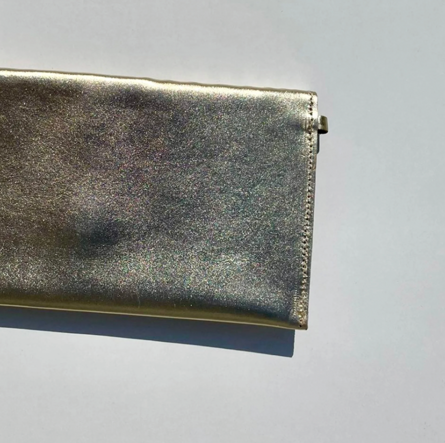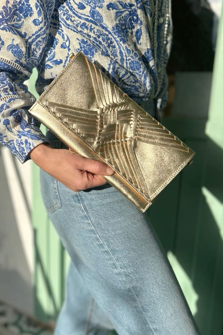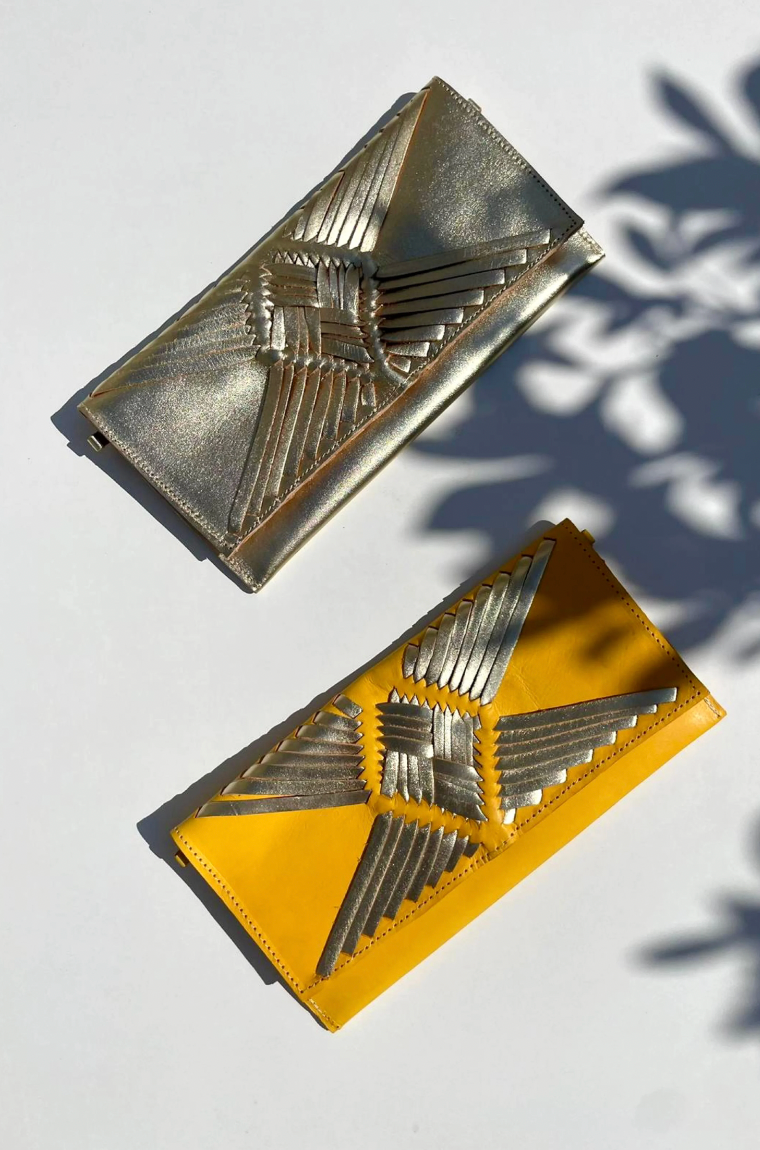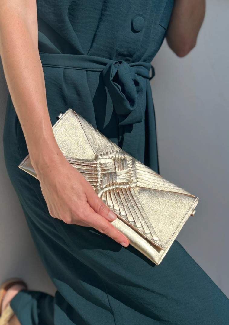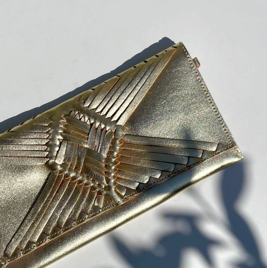 Pochette en cuir doré, tressée sur le devant entièrement à la main selon une technique traditionnelle mexicaine transmise depuis des siècles.