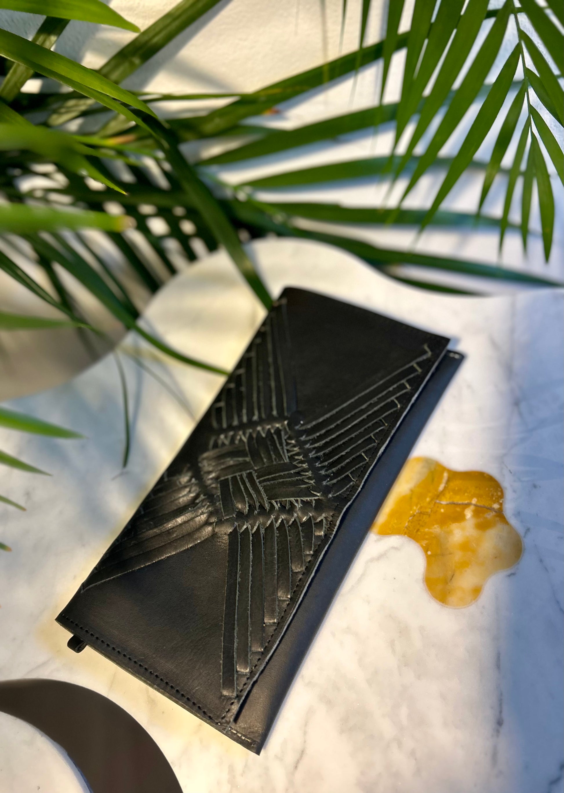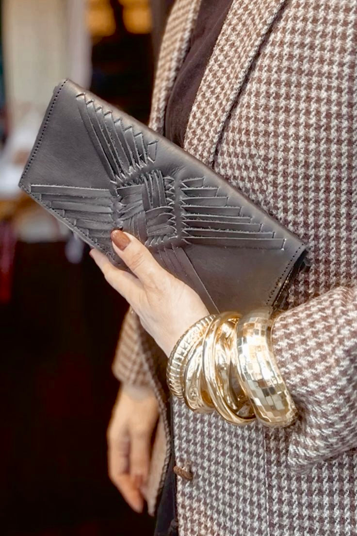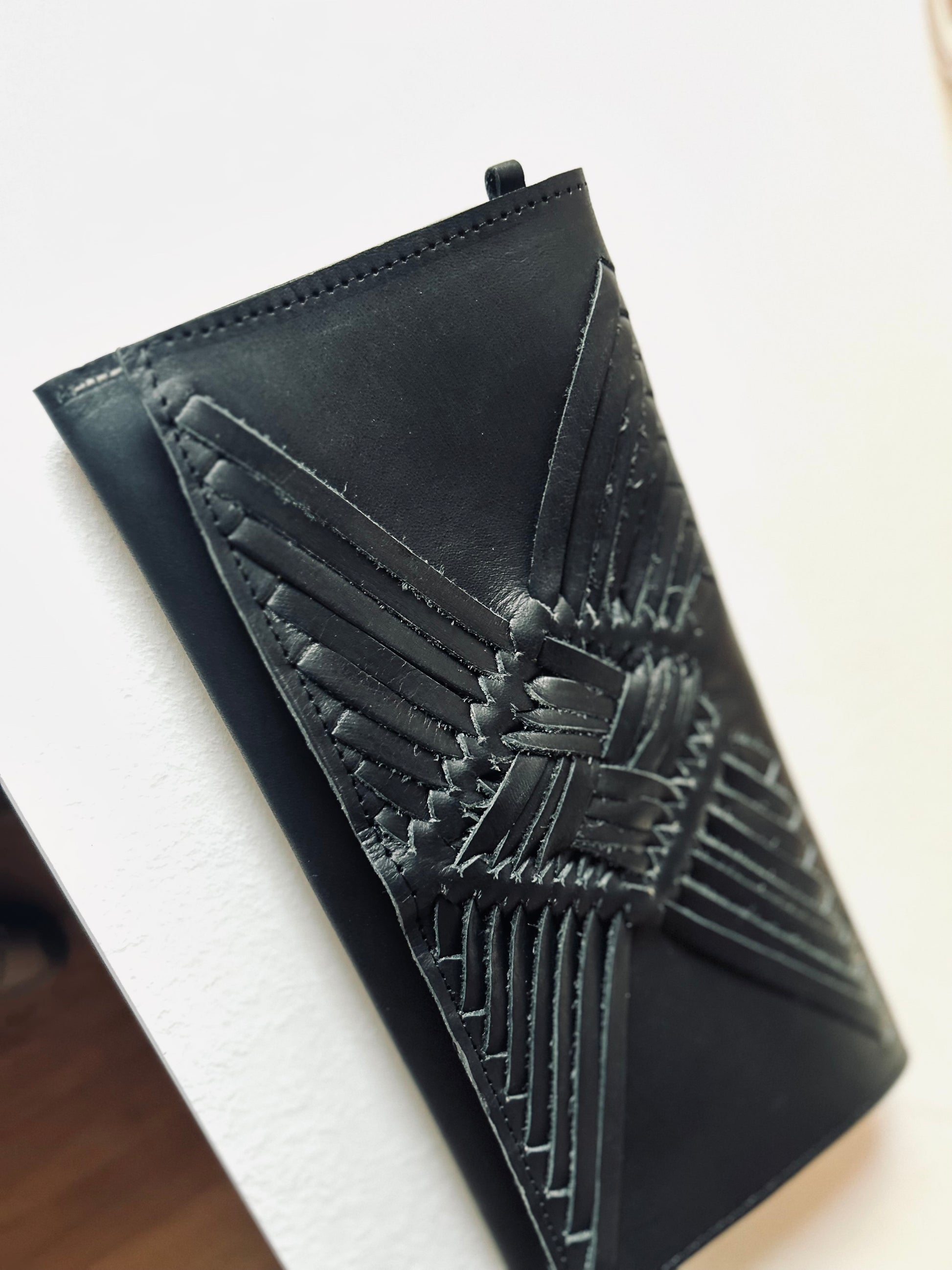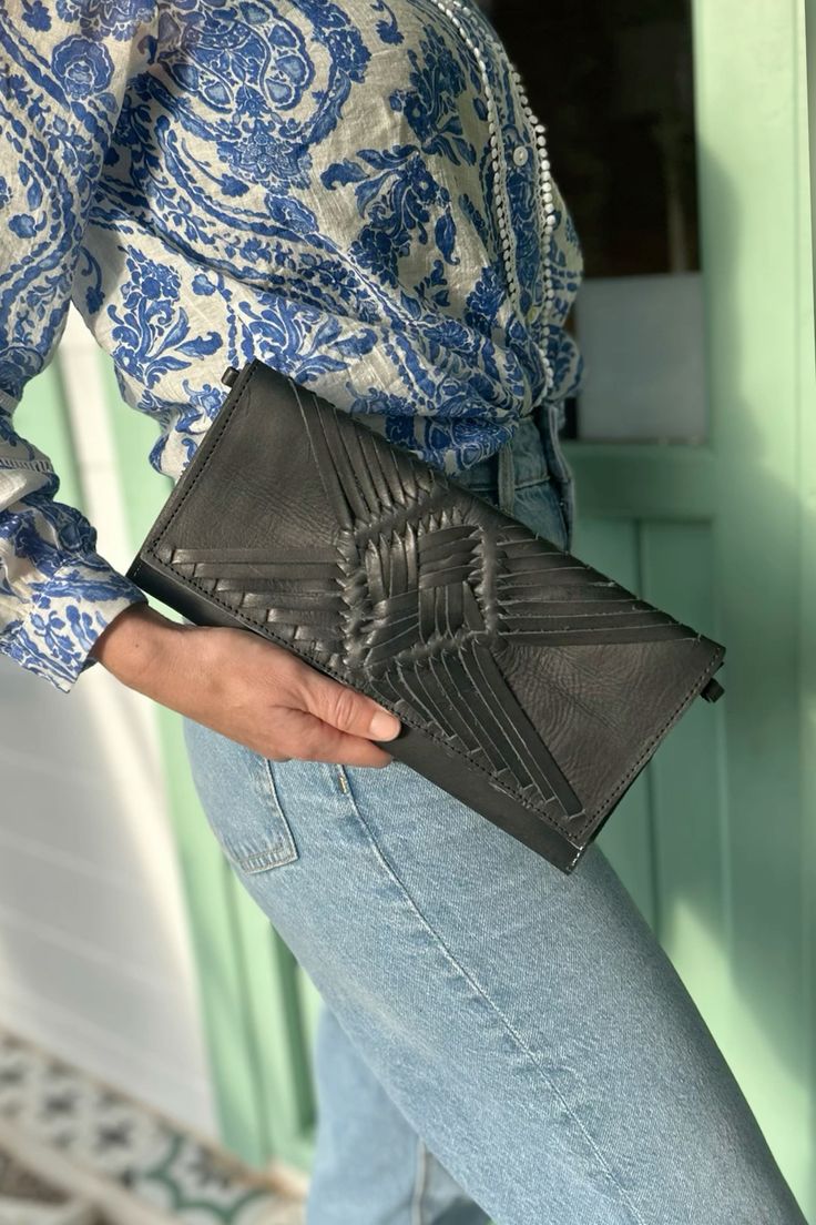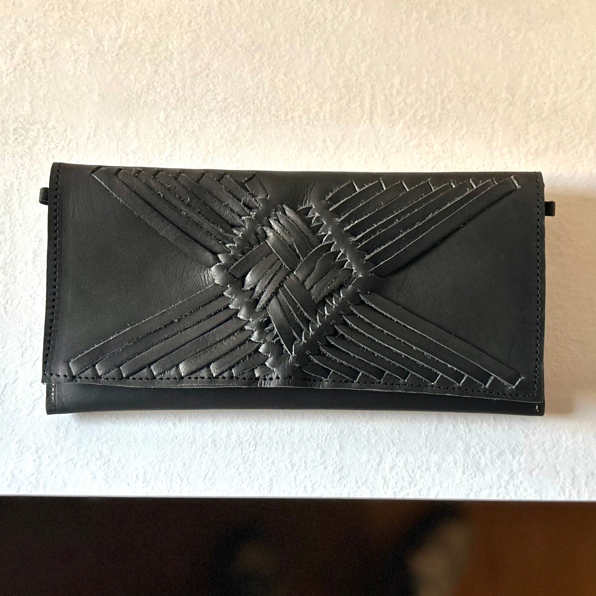Pochette en cuir noir, tressée sur le devant entièrement à la main selon une technique traditionnelle mexicaine transmise depuis des siècles.