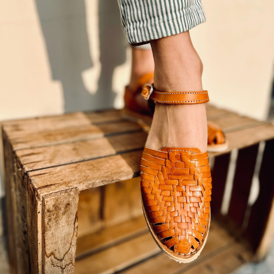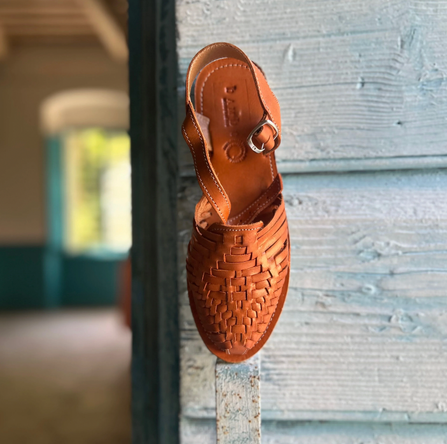 Sandale marron en cuir, tressée entièrement à la main selon une technique traditionnelle mexicaine transmise depuis des siècles.
