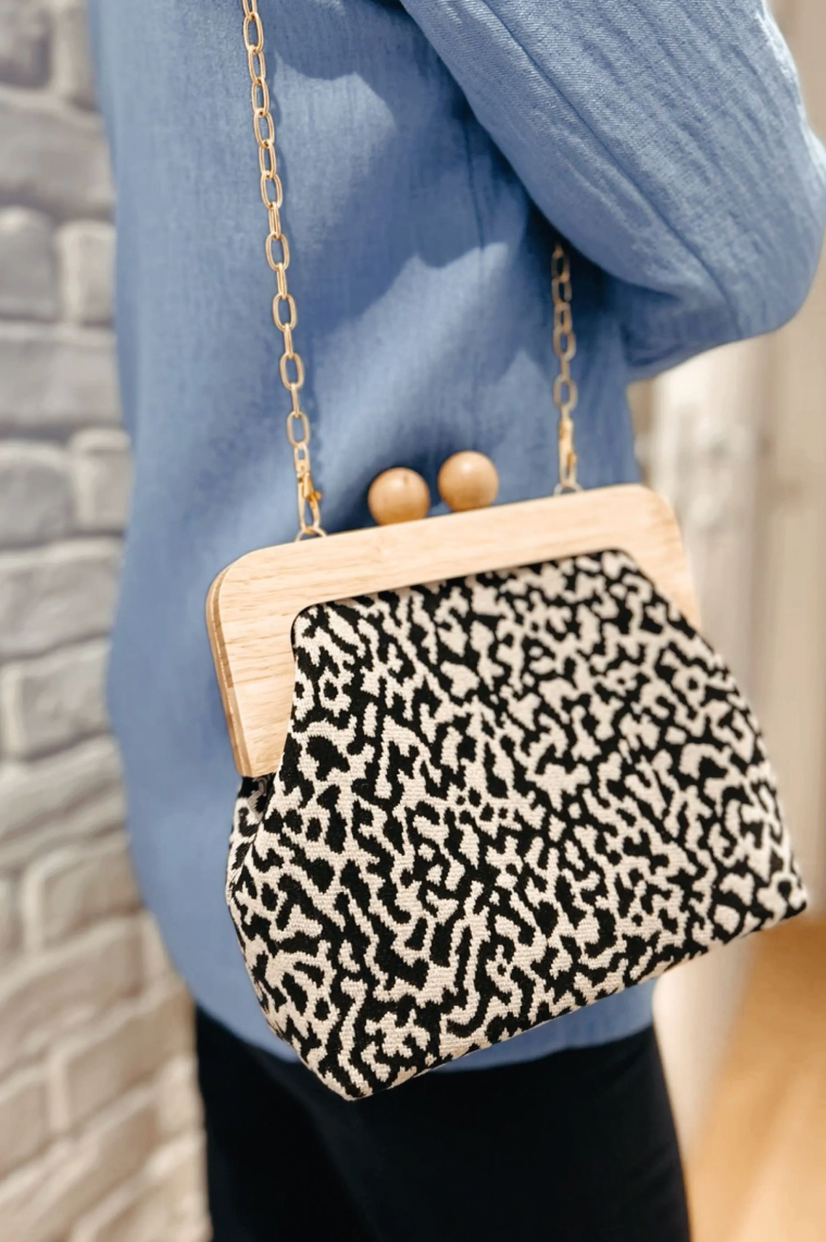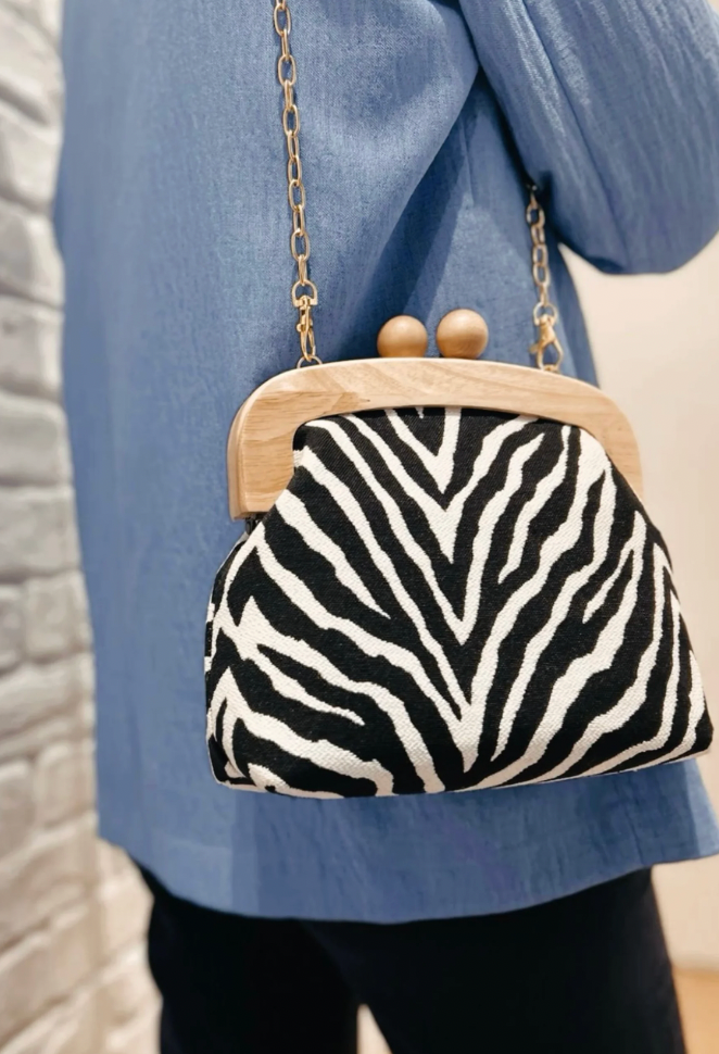 Élégante et moderne, notre clutch se distingue par ses motifs. Sa fermeture en bois et sa chaîne dorée détachable en font un accessoire à la fois pratique et raffiné, parfait pour toutes les saisons.