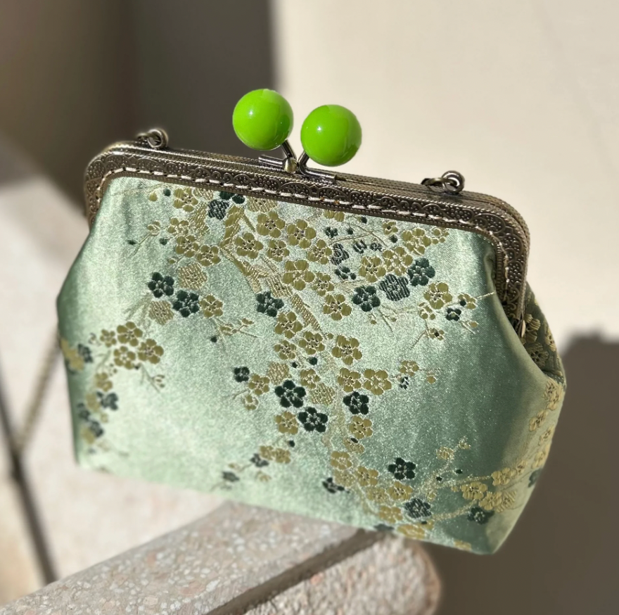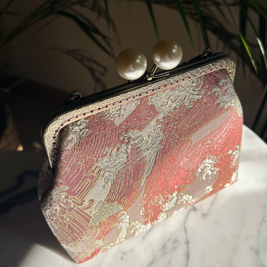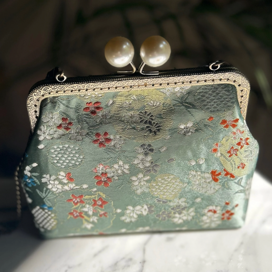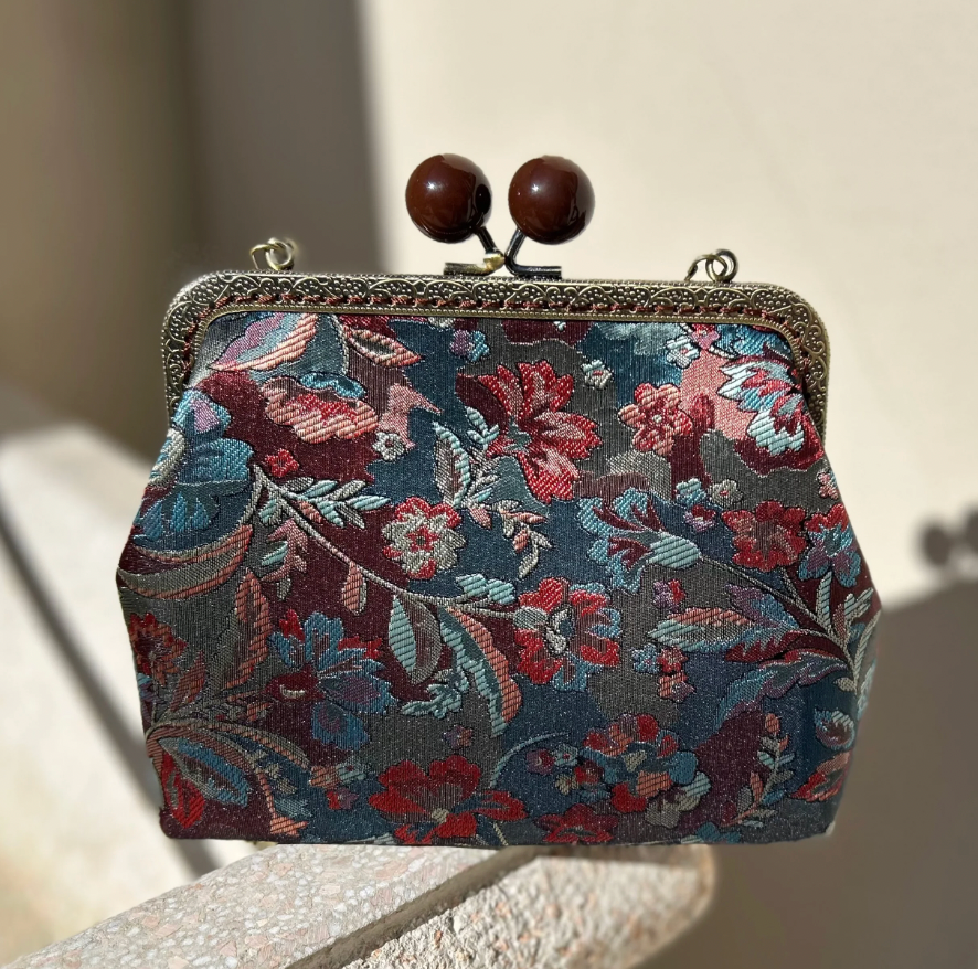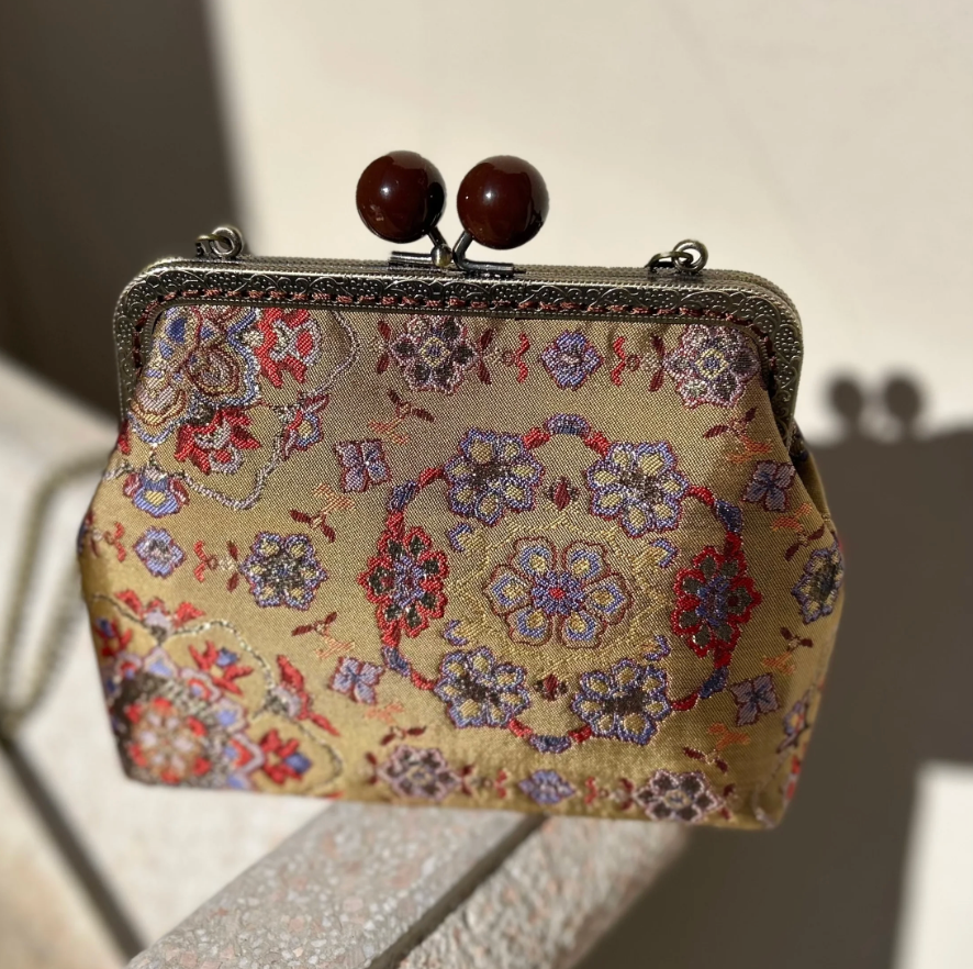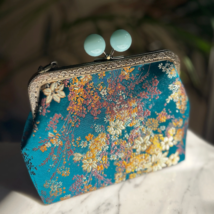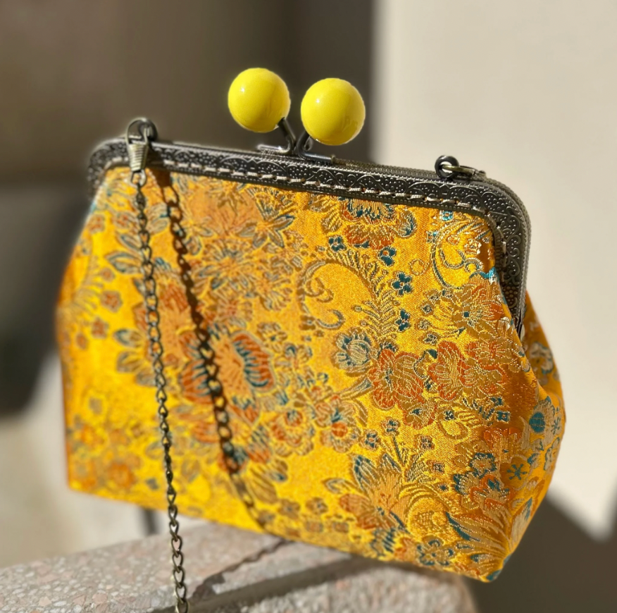Clutch réalisée en authentique tissu de soie oriental traditionnel. La bandoulière est détachable et la fermeture de notre pochette artisanale en fer est entièrement cousue à la main.