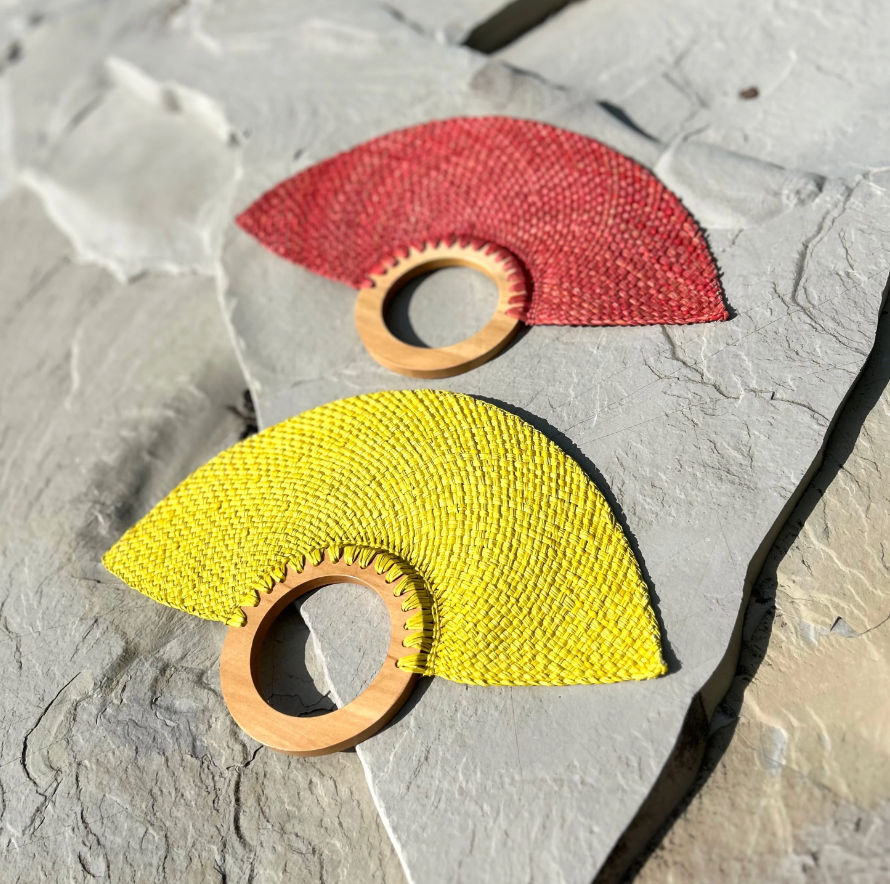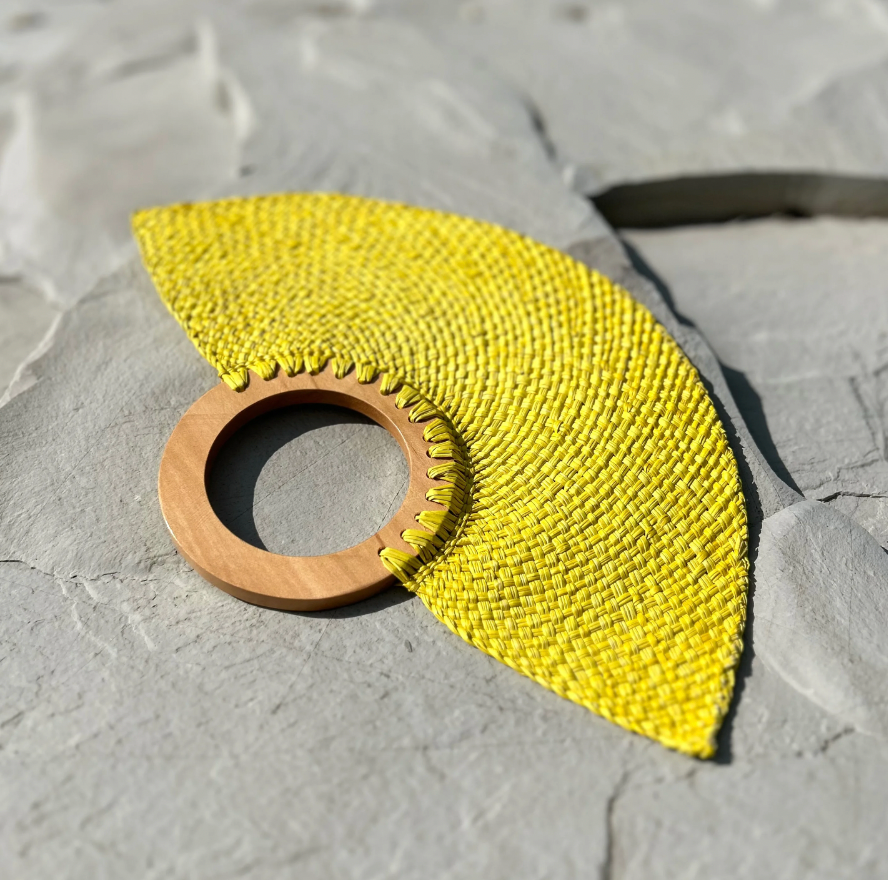 Éventail élégant jaune en bois et feuille de palmier Iraca.