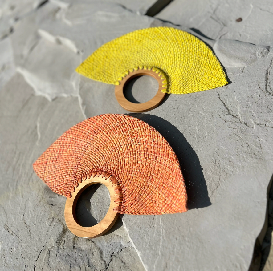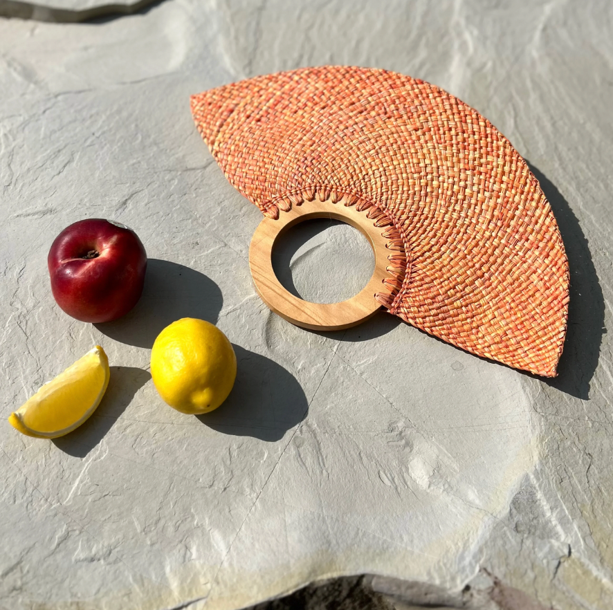 Éventail élégant orangé en bois et feuille de palmier Iraca.