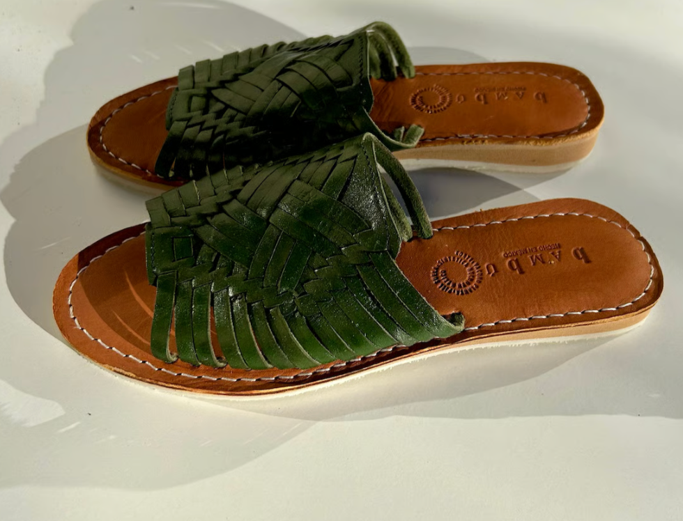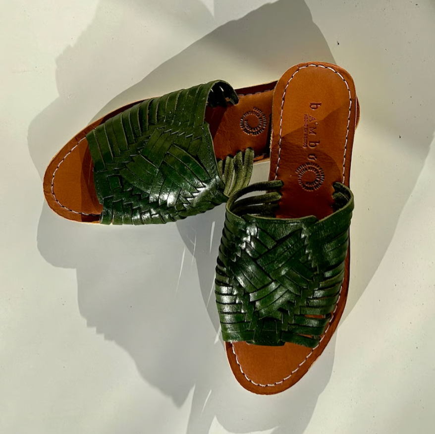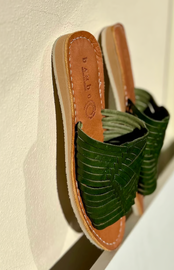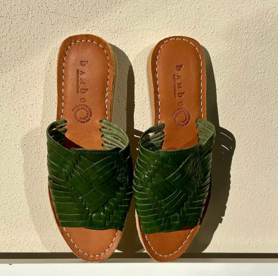 Sandale verte en cuir, tressée entièrement à la main selon une technique traditionnelle mexicaine transmise depuis des siècles.