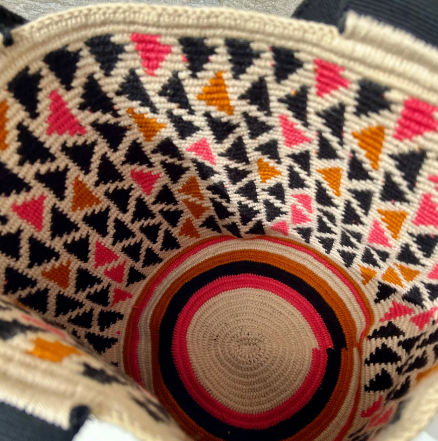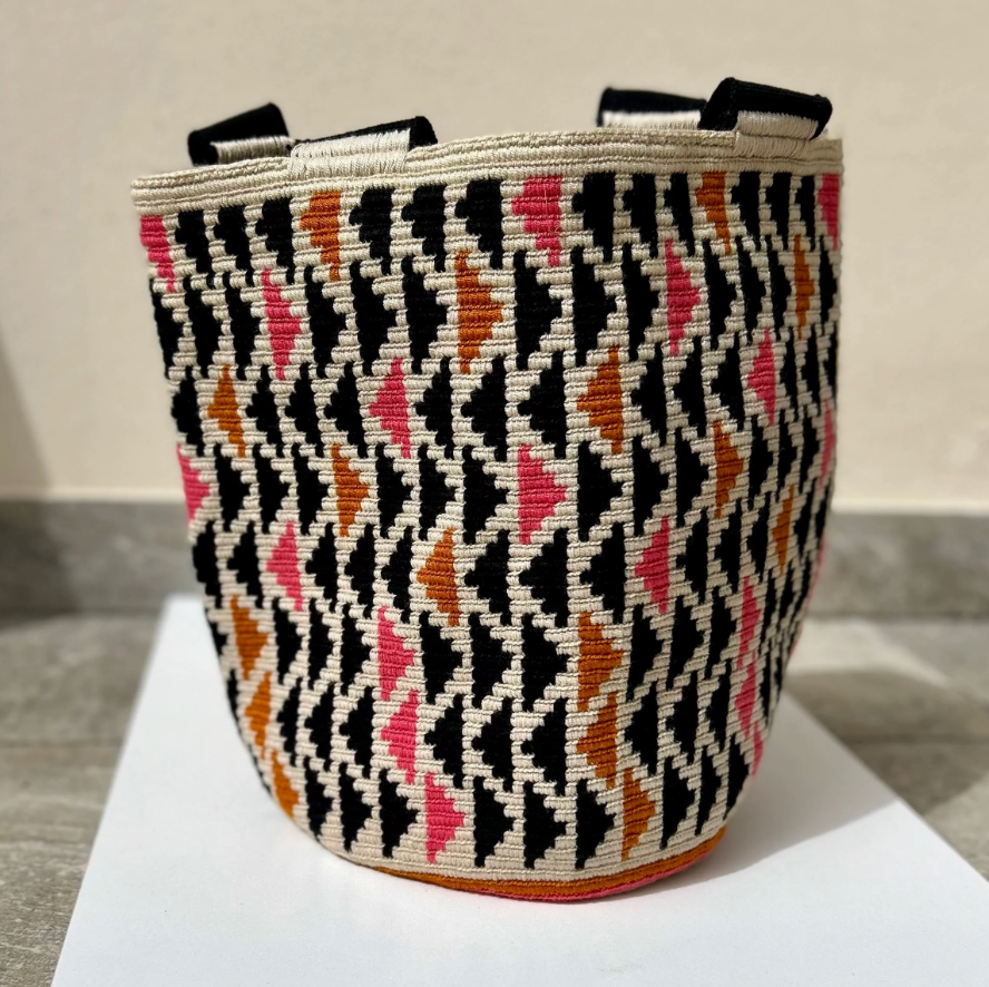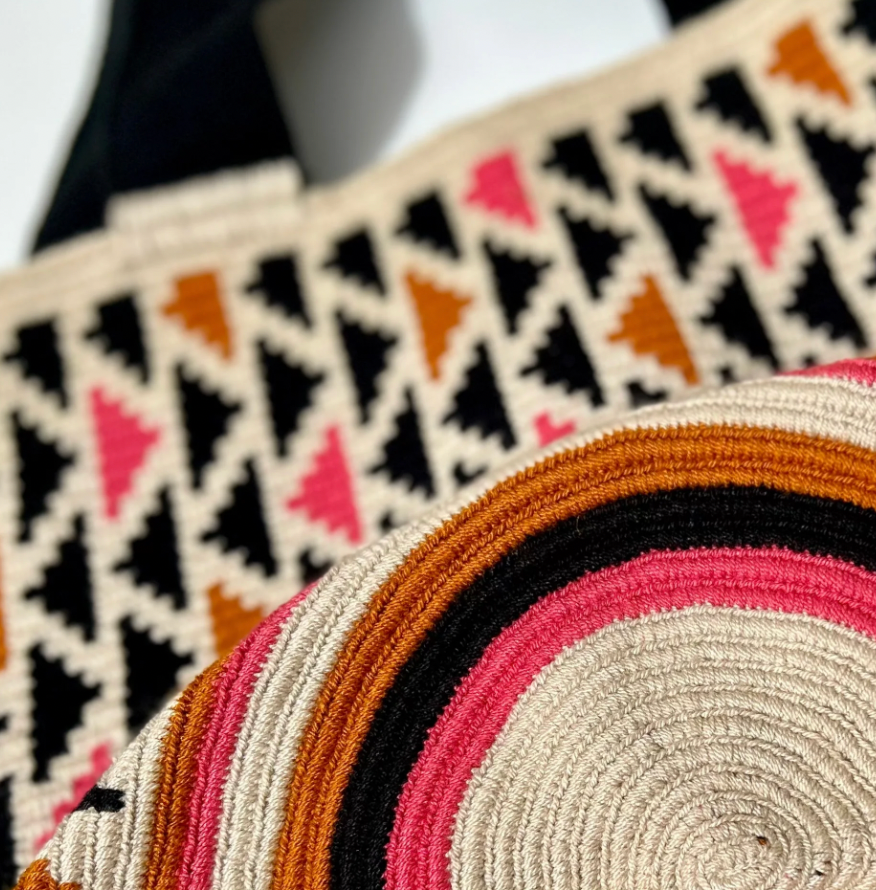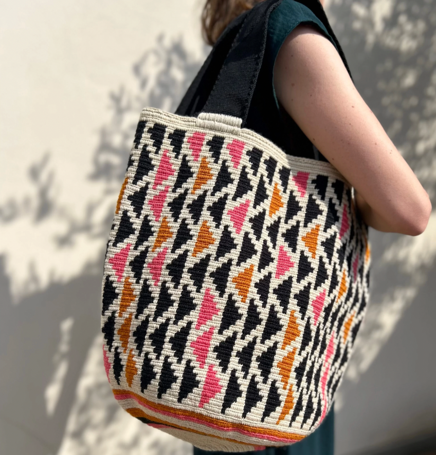 Découvrez la Mochila ANALIPA, une pièce d’exception entièrement réalisée à la main par les femmes du peuple Wayuu, au cœur du désert de la Guajira, en Colombie.