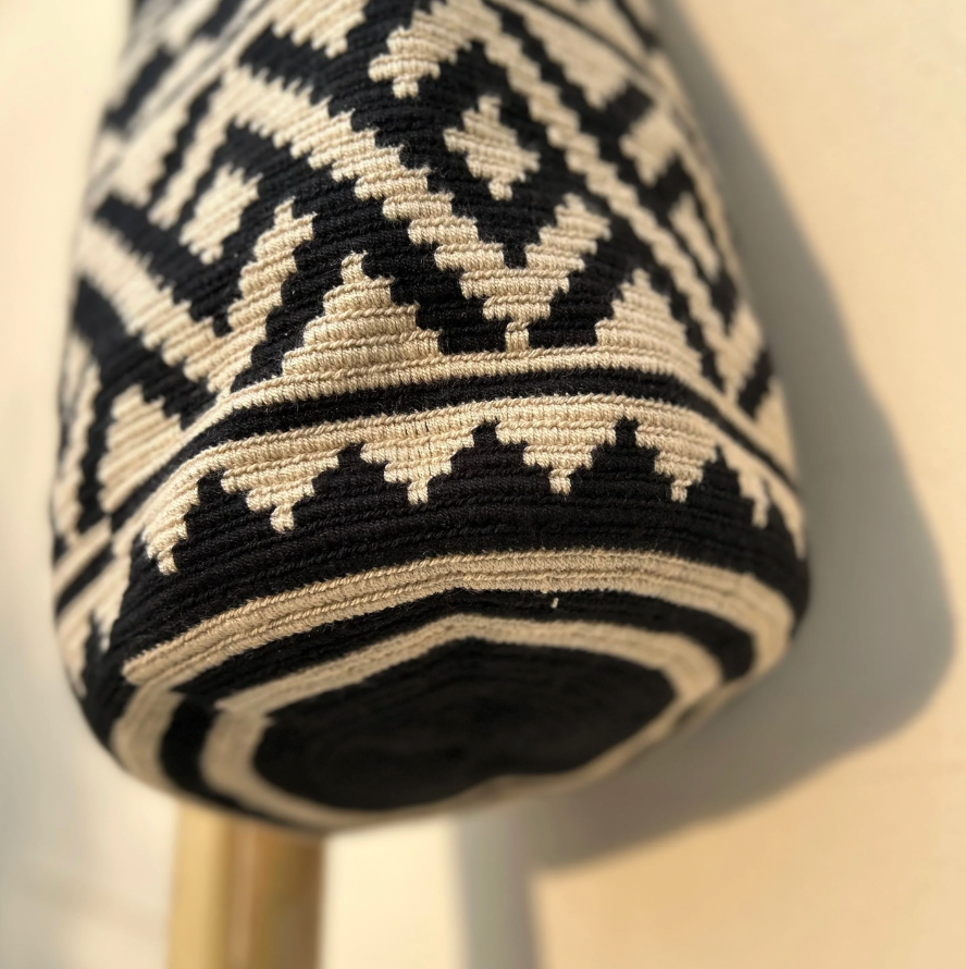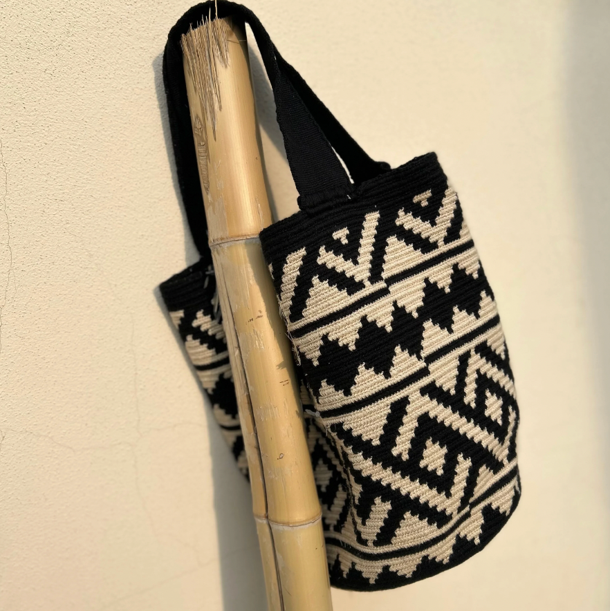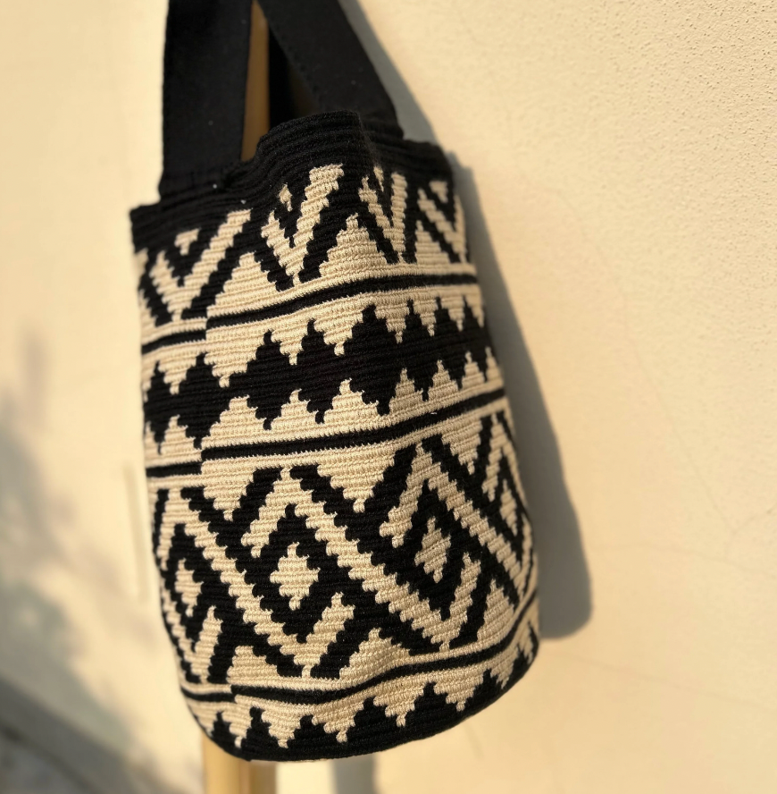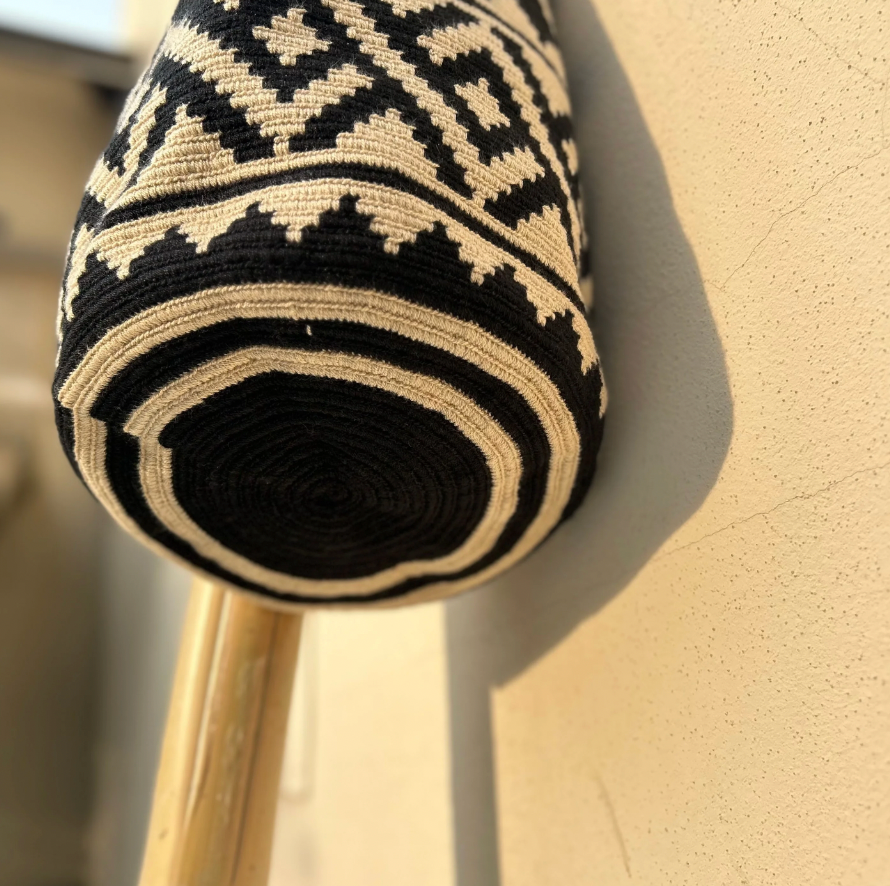 Découvrez la Mochila YURI, une pièce d’exception entièrement réalisée à la main par les femmes du peuple Wayuu, au cœur du désert de la Guajira, en Colombie.
