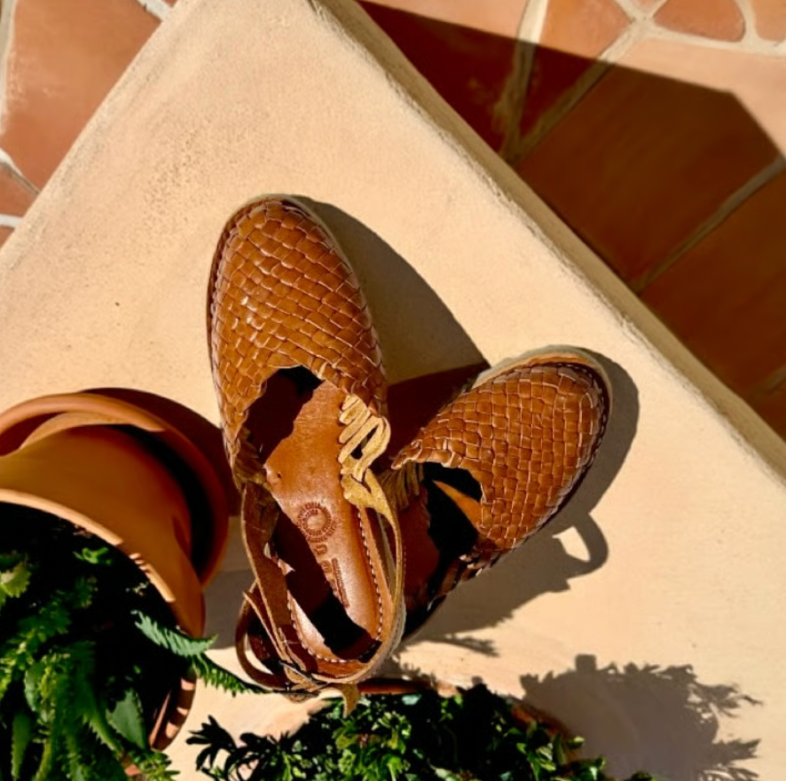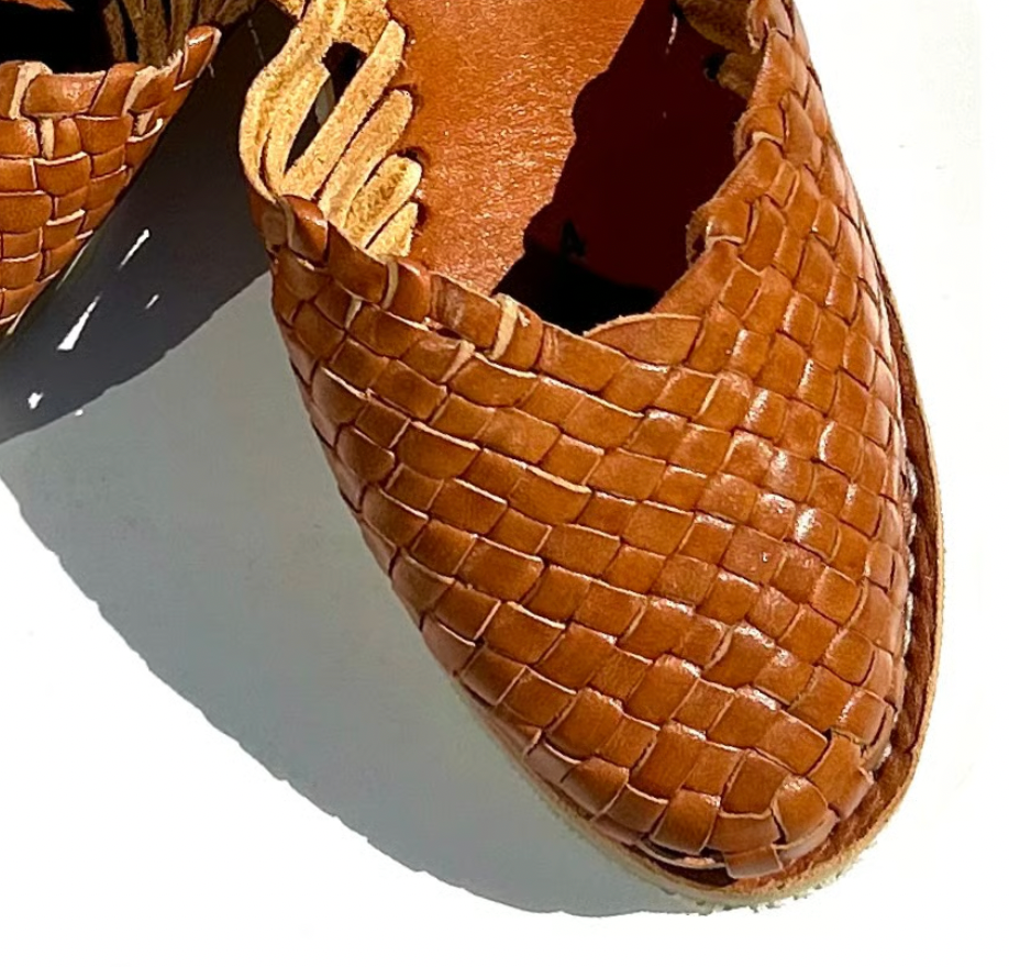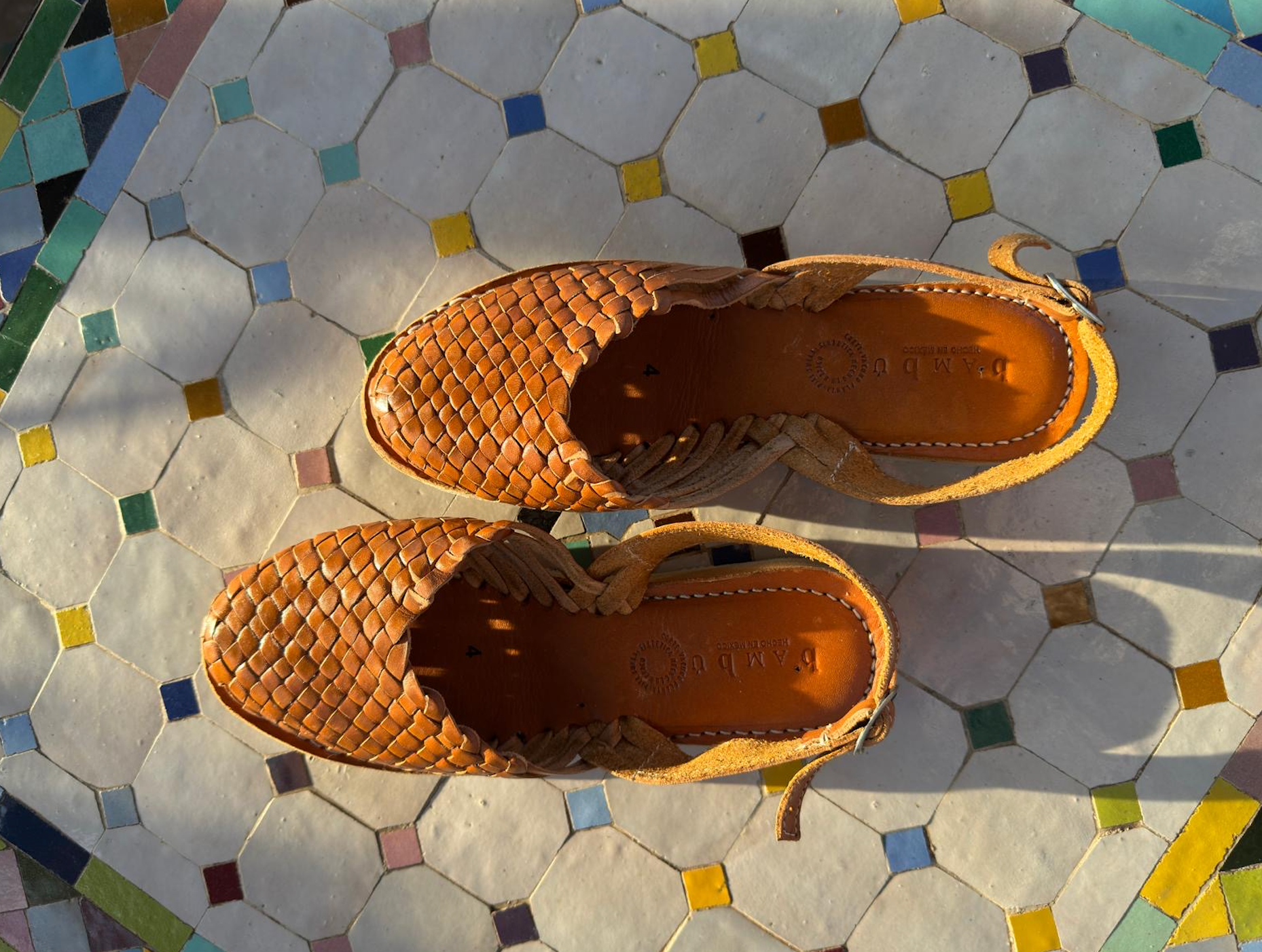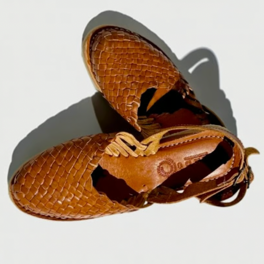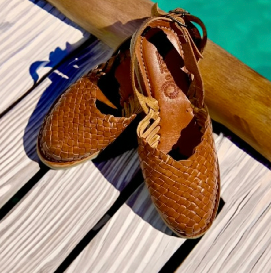 Sandale marron en cuir, tressée entièrement à la main selon une technique traditionnelle mexicaine transmise depuis des siècles.