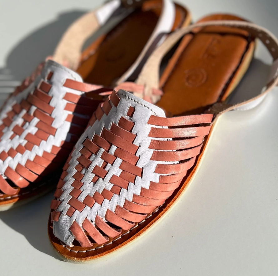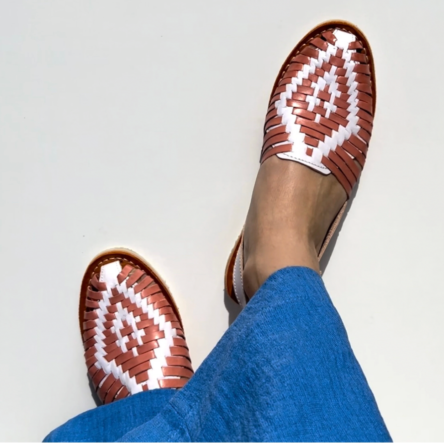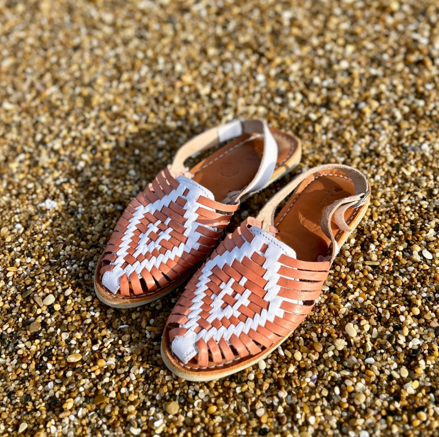 Sandale bicolore en cuir, tressée entièrement à la main selon une technique traditionnelle mexicaine transmise depuis des siècles.
