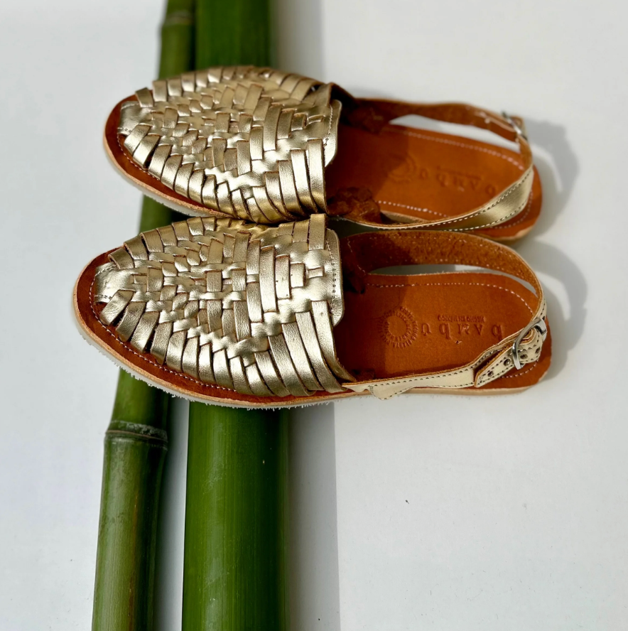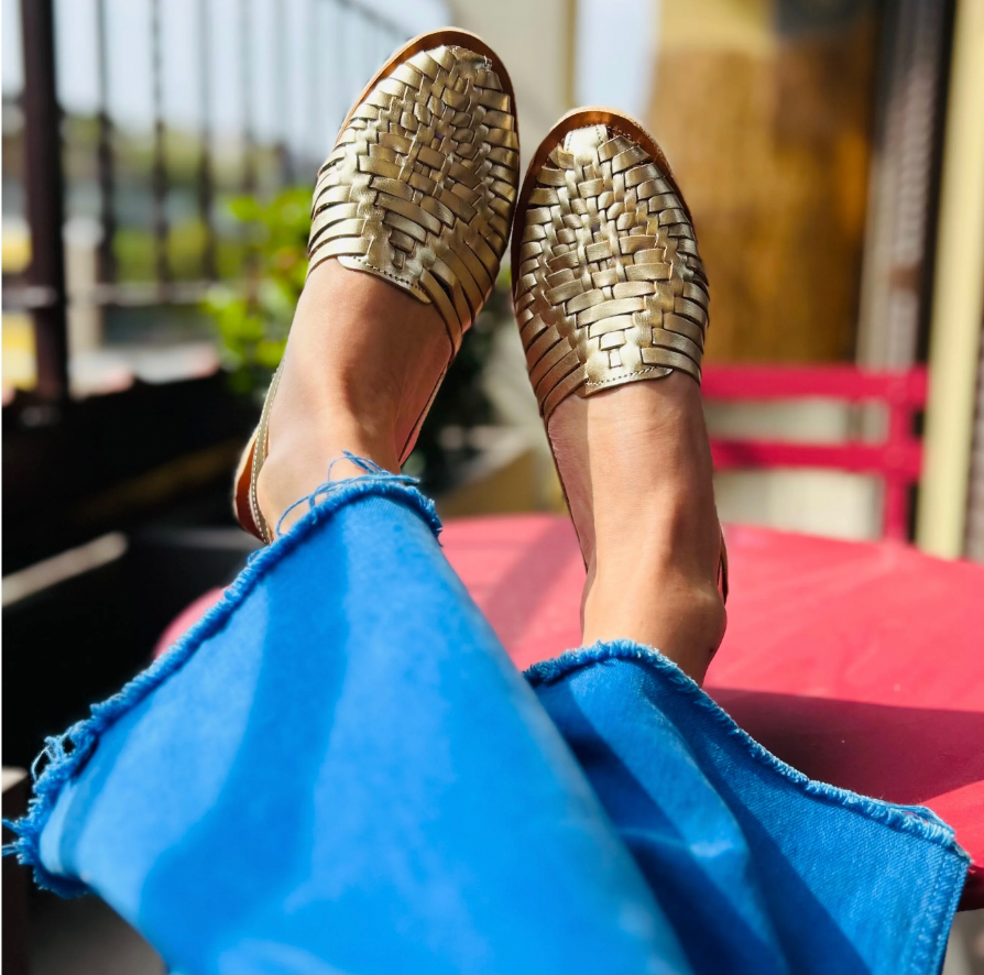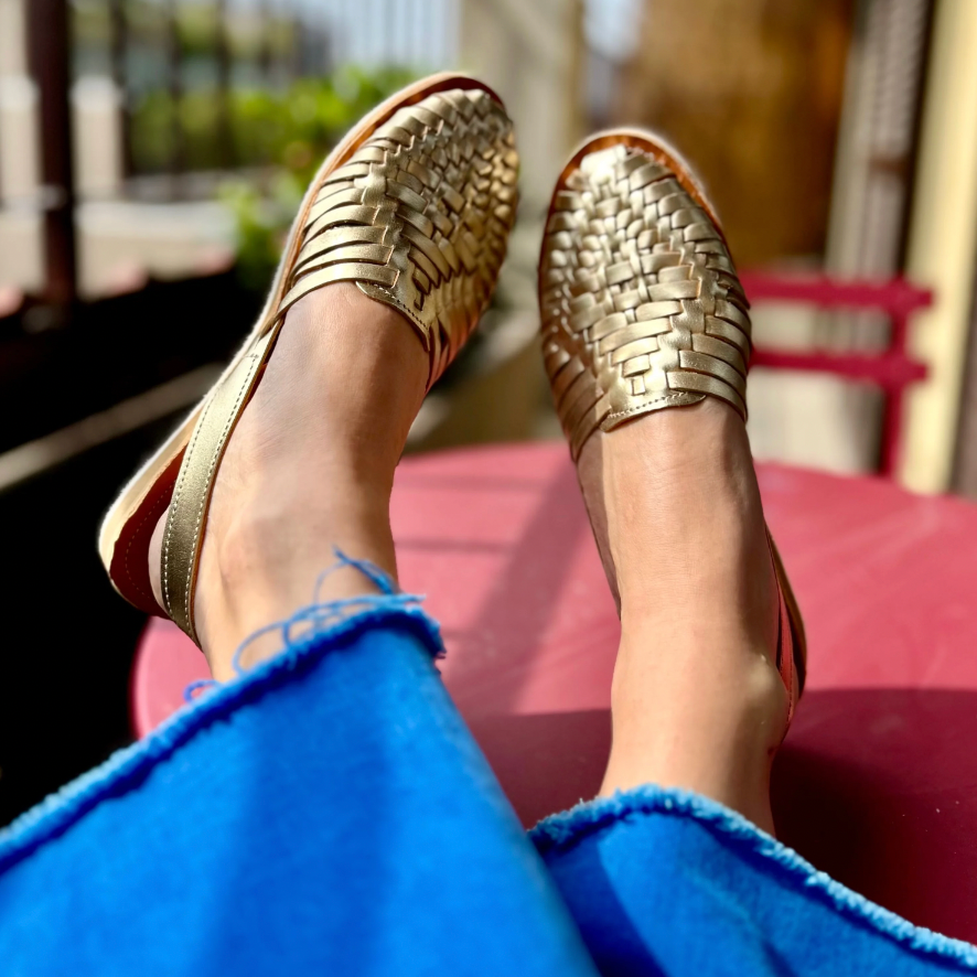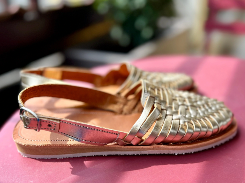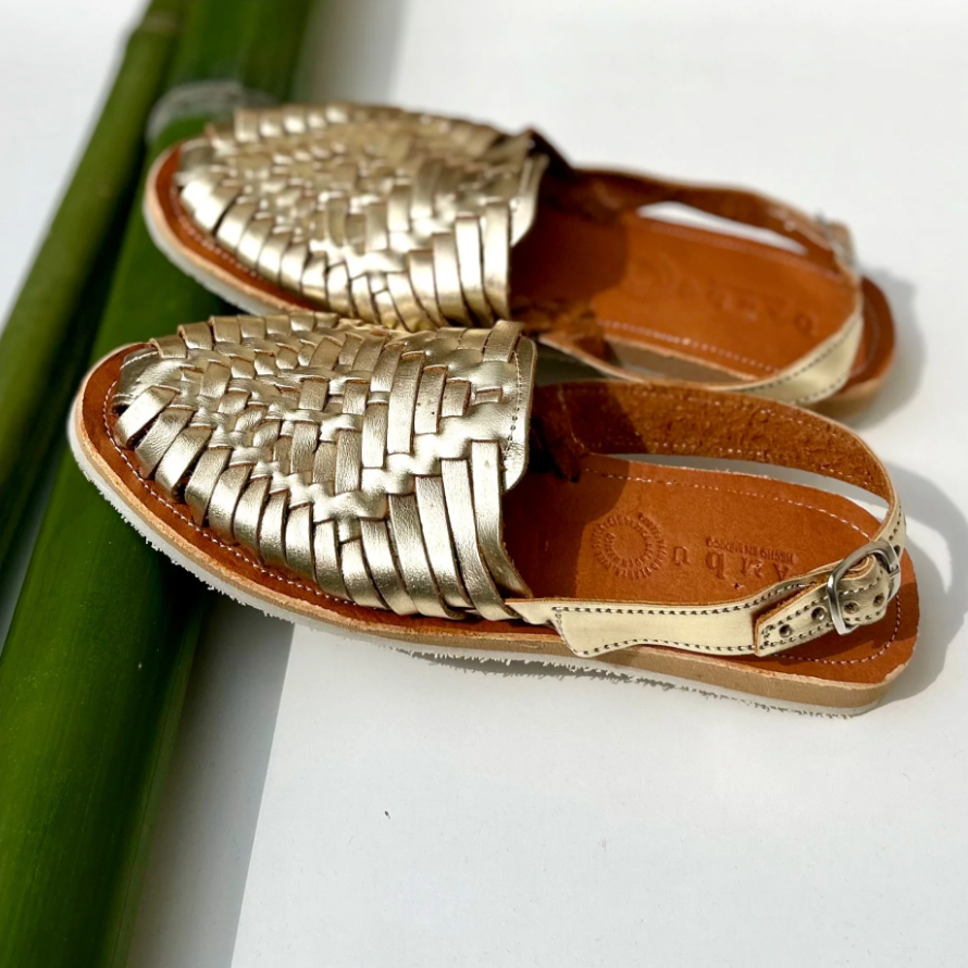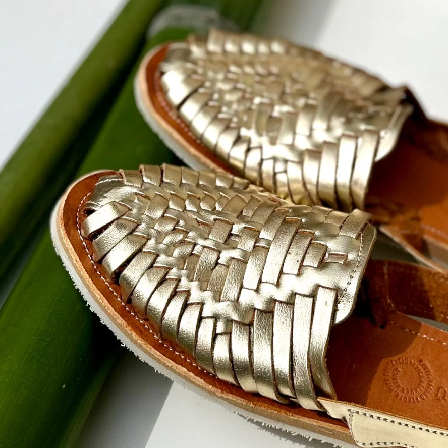 Sandale dorée en cuir, tressée entièrement à la main selon une technique traditionnelle mexicaine transmise depuis des siècles.