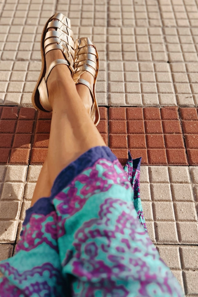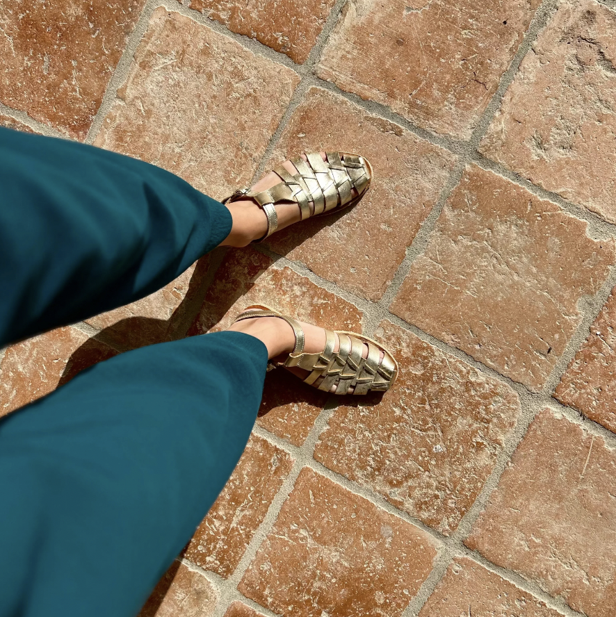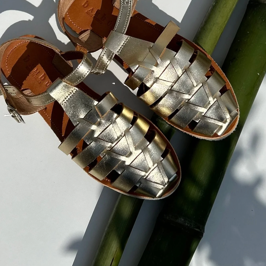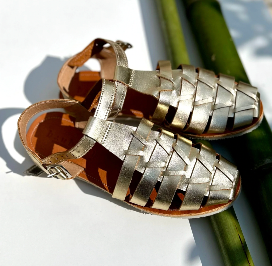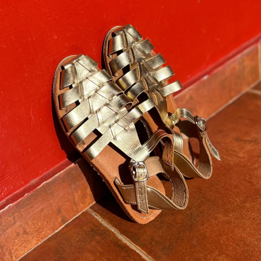 Sandale dorée en cuir, tressée entièrement à la main selon une technique traditionnelle mexicaine transmise depuis des siècles.