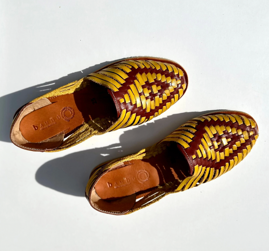 Sandale bicolore en cuir, tressée entièrement à la main selon une technique traditionnelle mexicaine transmise depuis des siècles.