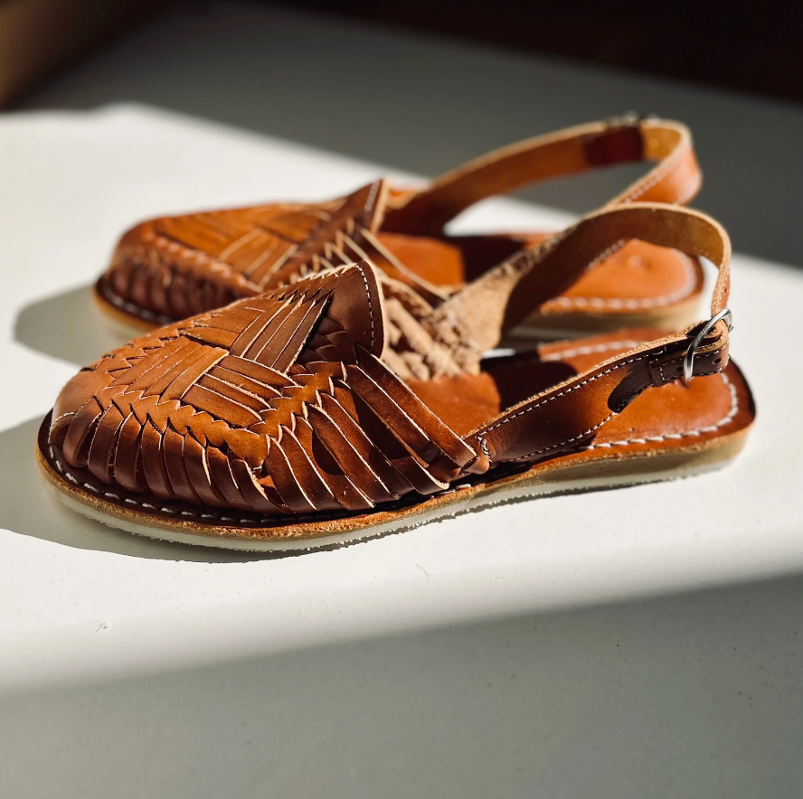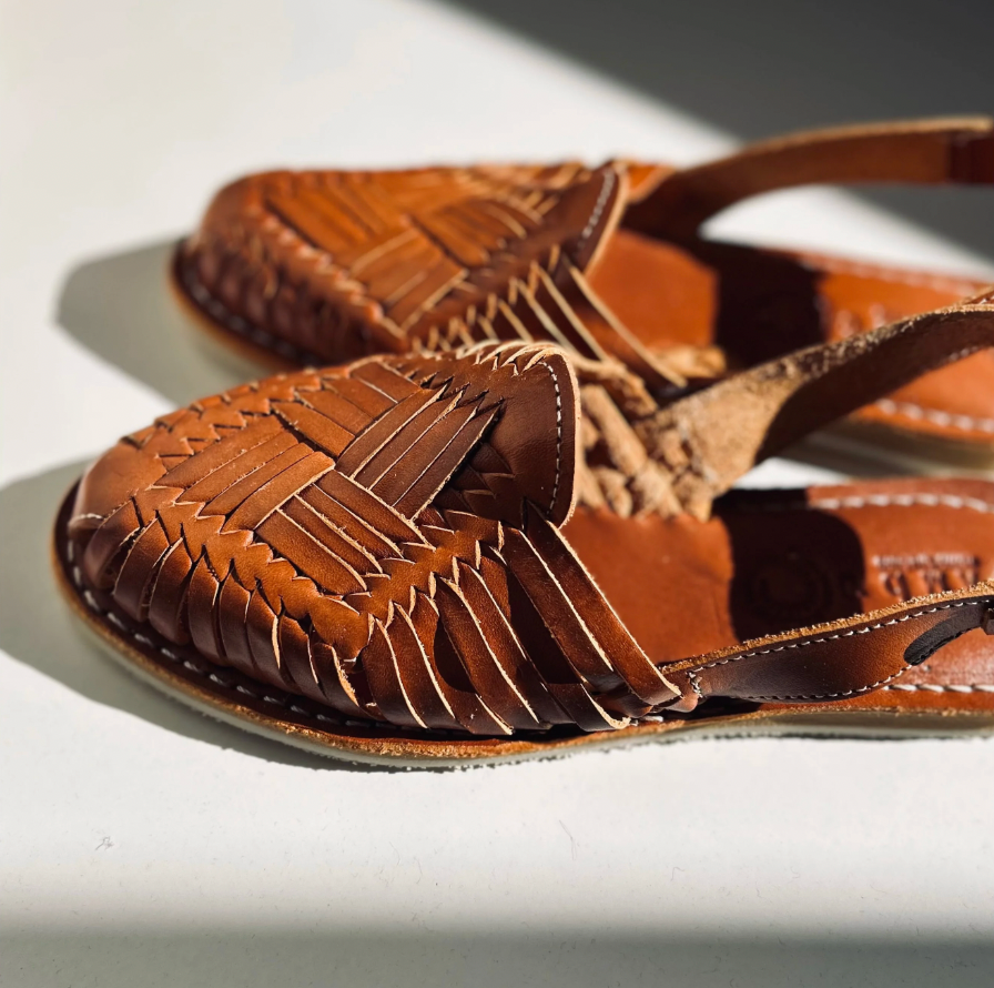 Sandale marron en cuir, tressée entièrement à la main selon une technique traditionnelle mexicaine transmise depuis des siècles.