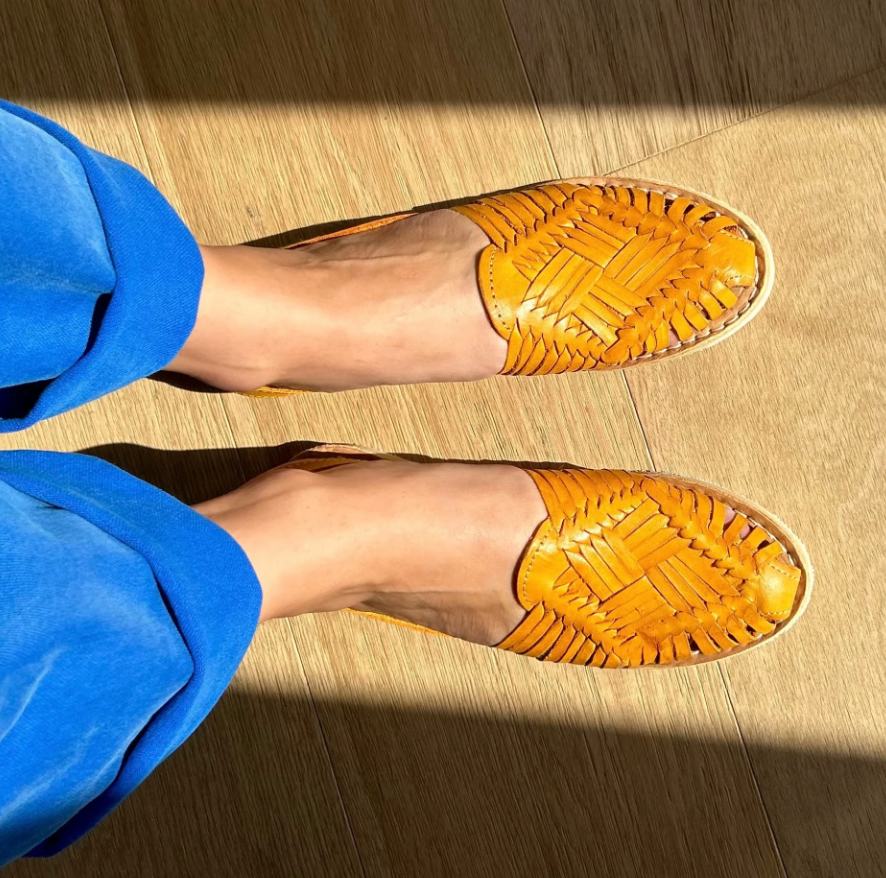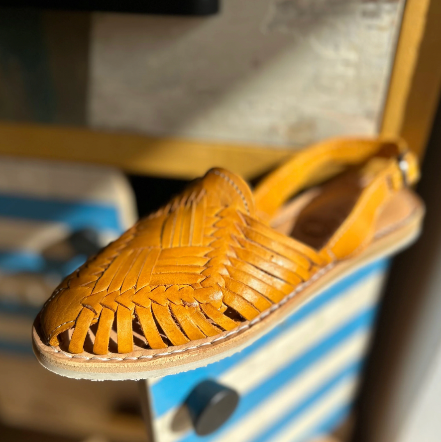 Sandale jaune moutarde en cuir, tressée entièrement à la main selon une technique traditionnelle mexicaine transmise depuis des siècles.
